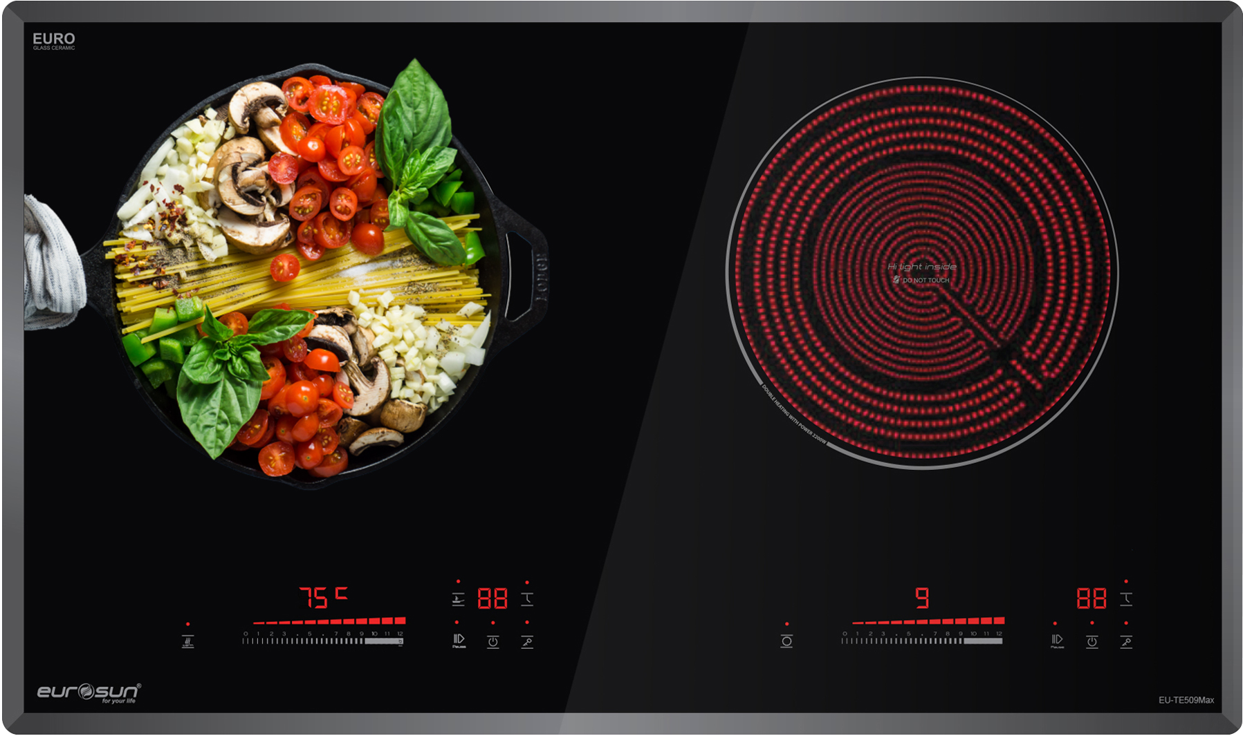 Bếp điện từ Eurosun EU-TE509Max thiết kế 2 bảng điều khiển dạng trượt Slider Control độc lập cho từng vùng nấu với 12 dải công suất cùng các tiện ích được cài đặt sẵn. Siêu nhạy, dễ dàng sử dụng và phù hợp với nhiều lứa tuổi