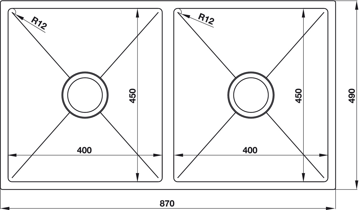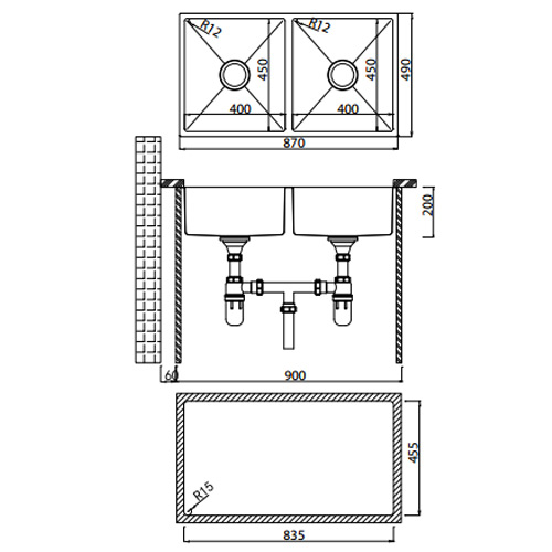 Chậu có kích thước tổng thể 870 × 490mm, với hai hố cân đối (400 × 450mm) được thiết kế hình chữ nhật sắc nét, phù hợp với không gian bếp hiện đại. Phần viền được bo góc nhẹ tạo cảm giác mềm mại, nhưng vẫn giữ được sự khỏe khoắn và cá tính trong tổng thể thiết kế.