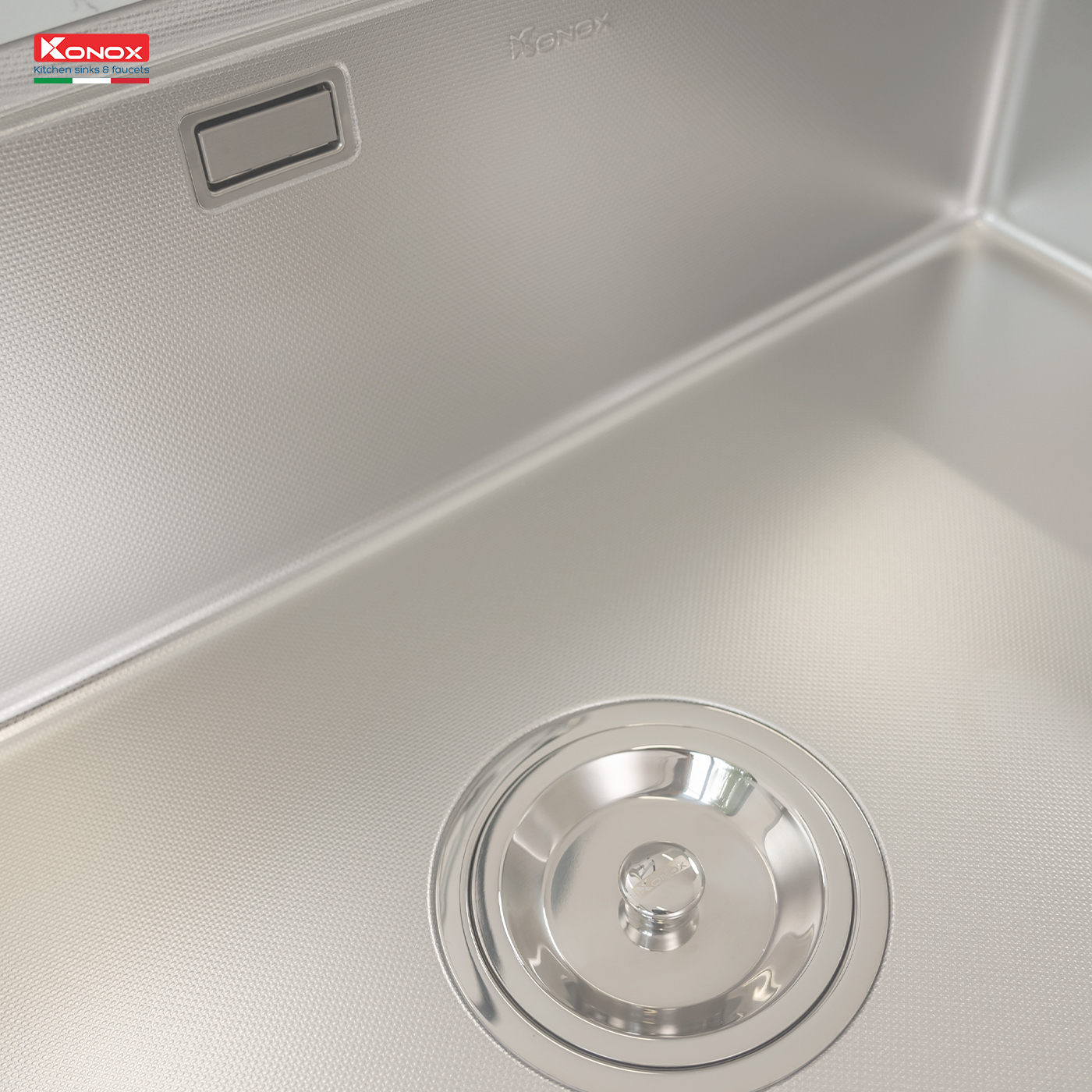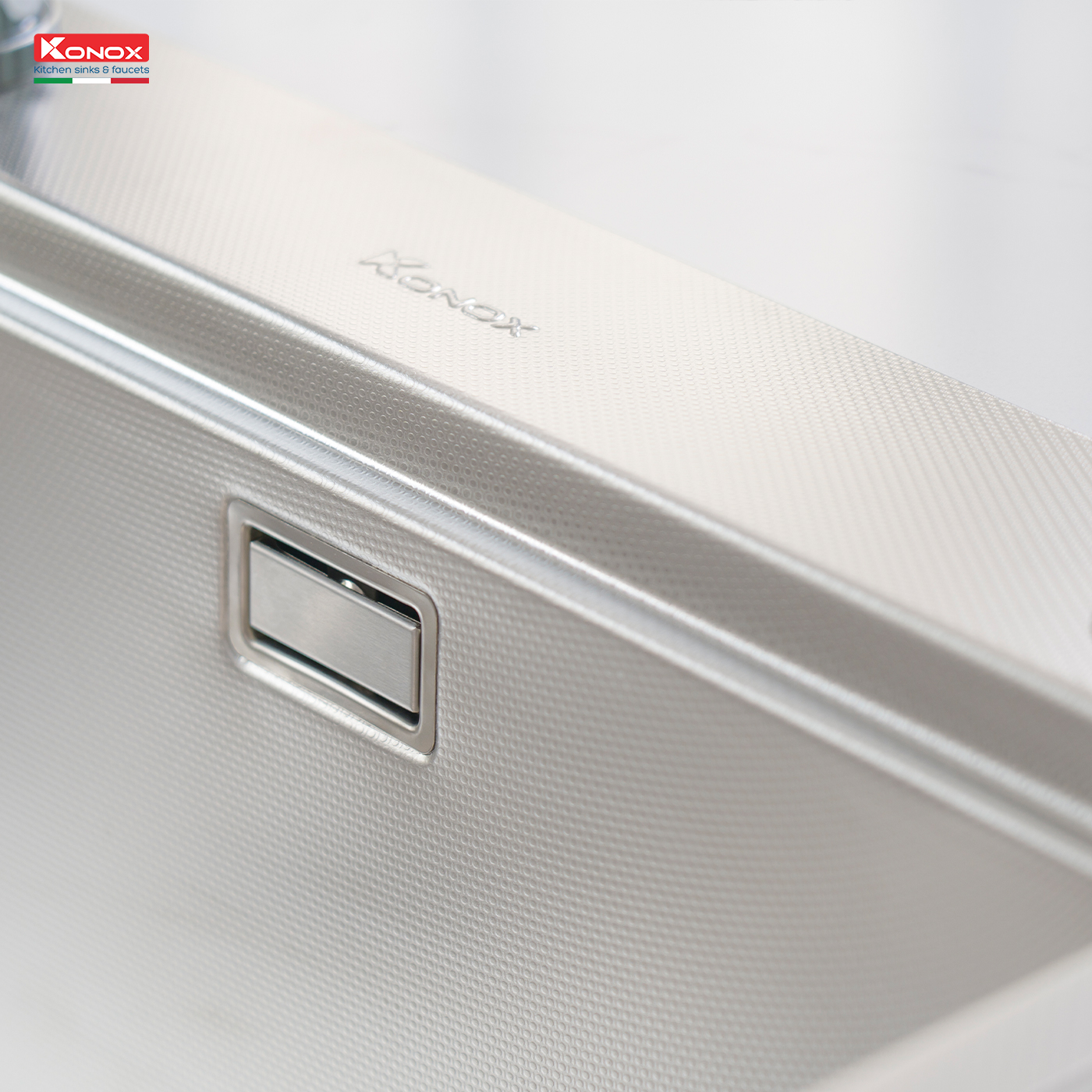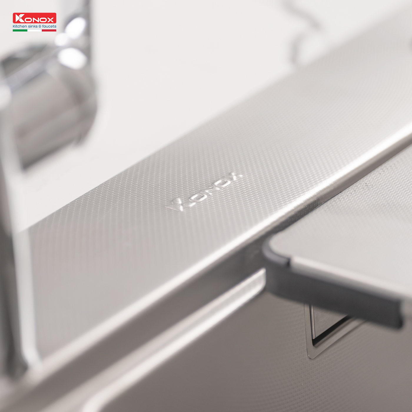 Sản phẩm được gia công từ thép không gỉ Inox 304 cao cấp, độ dày 1.2mm – đảm bảo khả năng chống ăn mòn, chống oxy hóa cực tốt, đặc biệt an toàn cho sức khỏe người dùng. Lớp phủ Dekor đặc trưng của Konox giúp tăng cường khả năng chống trầy xước, giảm thiểu dấu vết sau thời gian dài sử dụng và dễ dàng vệ sinh.