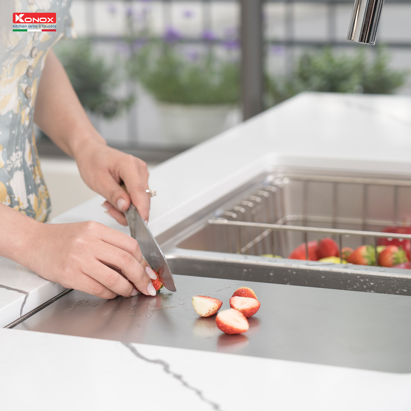 Dekor Series hướng tới tối ưu trải nghiệm của người dùng với căn bếp thường ngày, xua tan nỗi lo chậu hoen ố, xước và mất thẩm mỹ qua thời gian sử dụng. Chậu rửa Konox KN8646DU Dekor được tối ưu công năng nhờ thiết kế chậu 2 hố cân hạ bậc, tích hợp phụ kiện đi kèm, biến chậu rửa bát thông thường thành “trạm sơ chế” đa năng.
