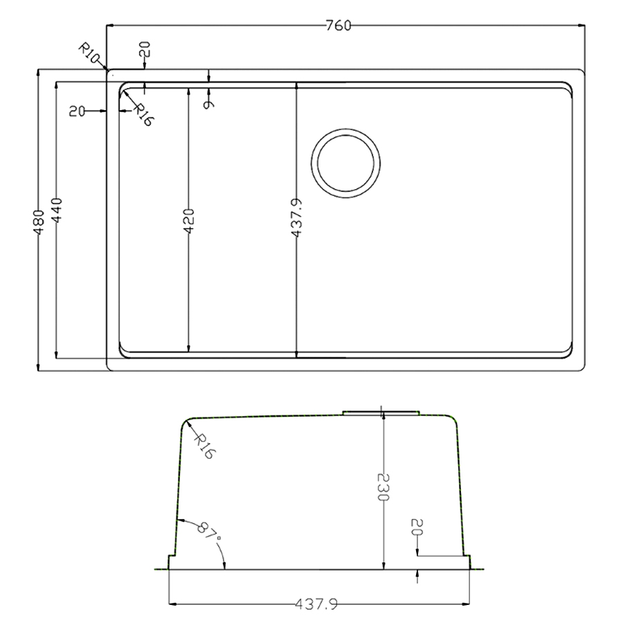- Vệ sinh lòng chậu dễ dàng với góc lượn R16 mm