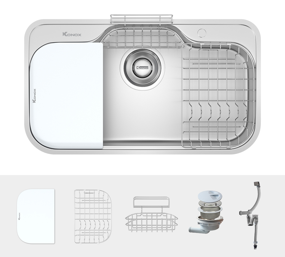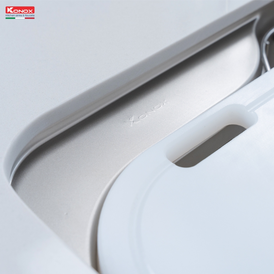- Chậu rửa Konox Tari 9051SR thiết kế hiện đại với gờ hạ bậc – tích hợp phụ kiện thông minh: Thớt nhựa, rổ úp bát, siphon