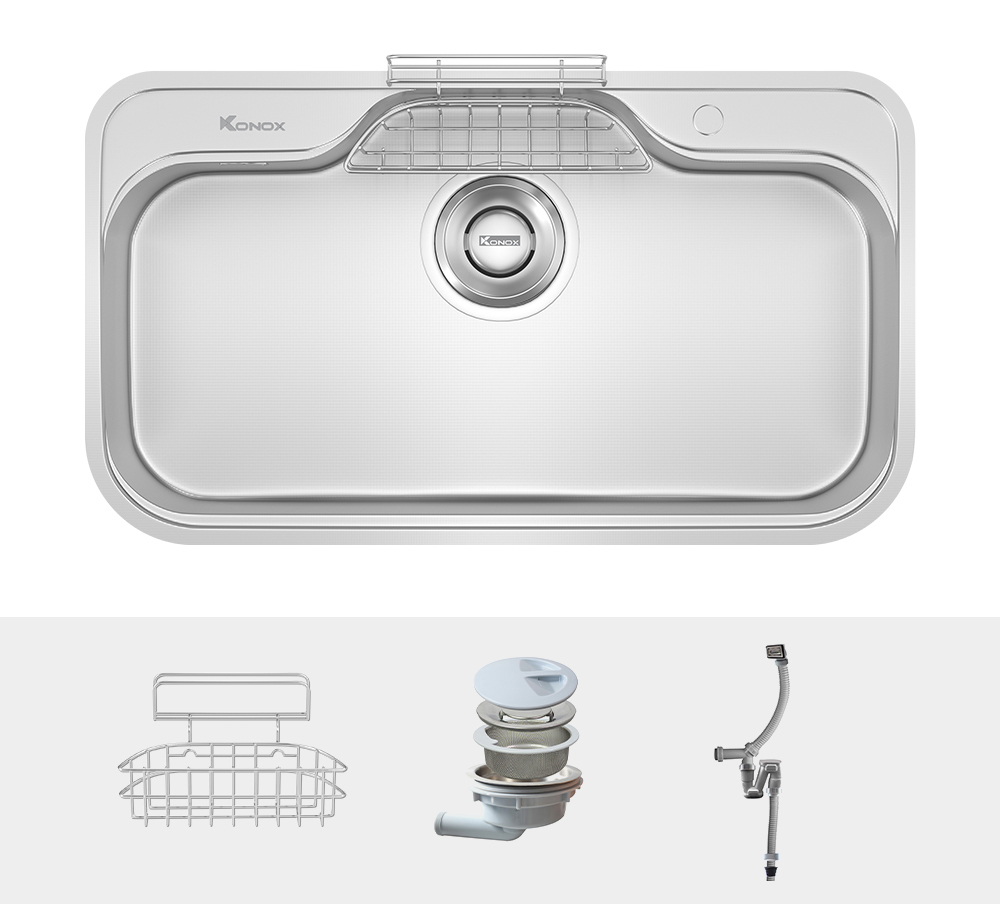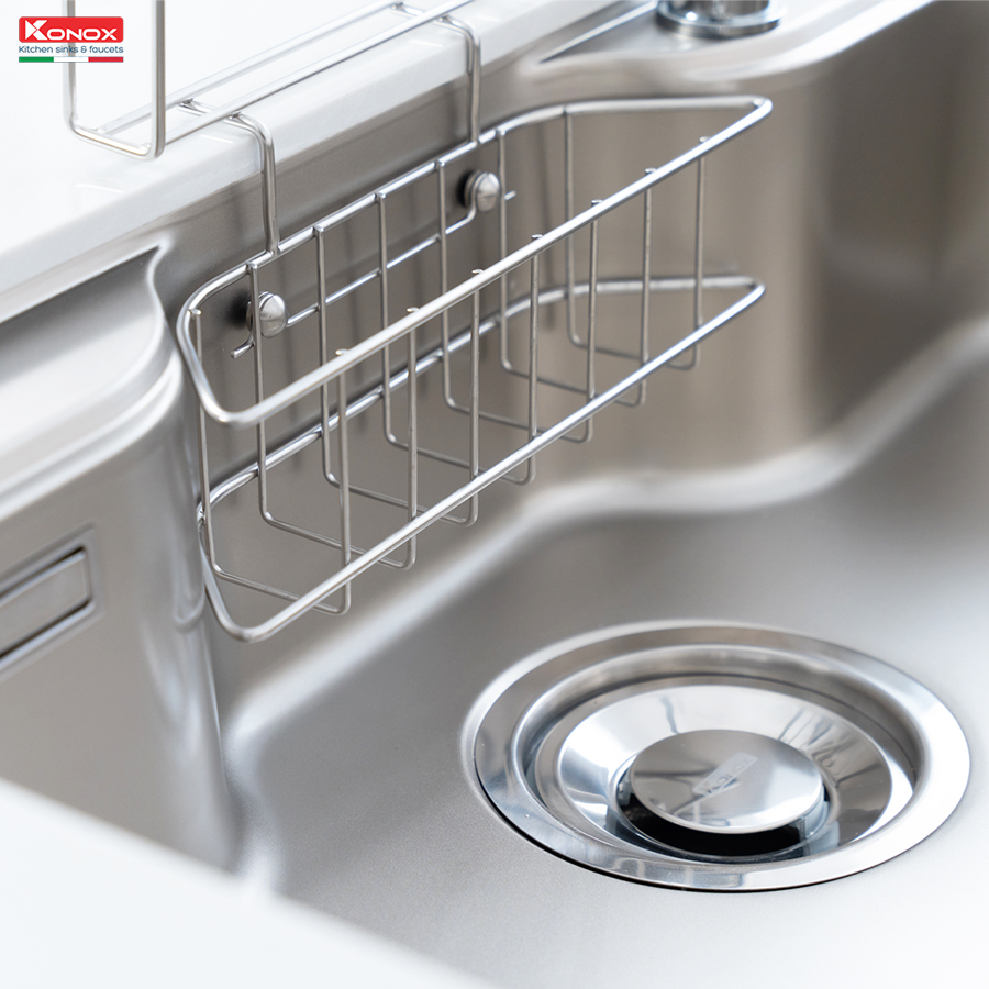 - Chậu rửa Konox Tari 9051SR Basic thiết kế hiện đại với gờ hạ bậc – tích hợp phụ kiện thông minh: Thớt nhựa, rổ úp bát, siphon
