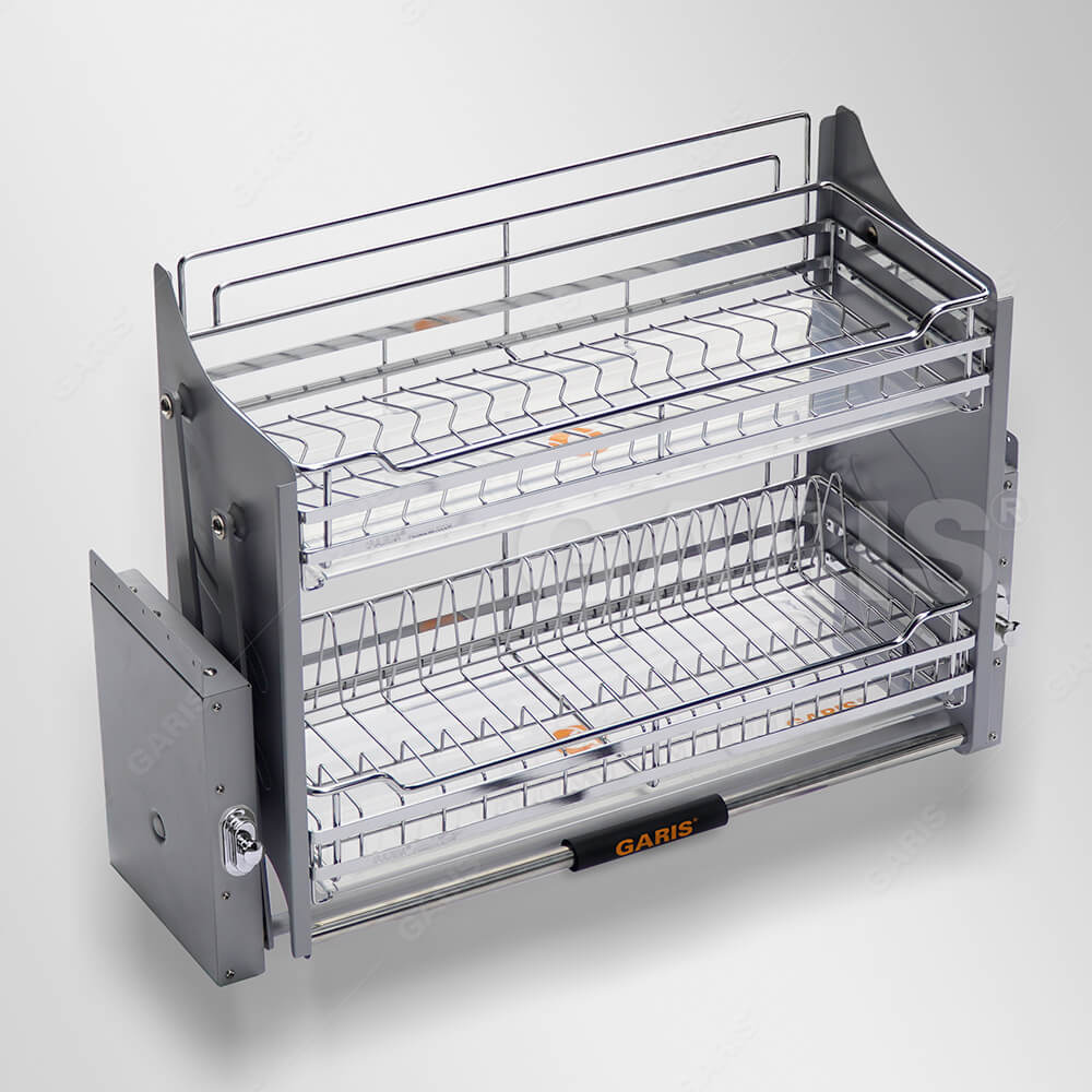 Giá bát đĩa nâng hạ Inox 304 nan dẹt mạ Chrome 5 lớp Garis GL06.70C được thiết kế 2 tầng thông thoáng, rộng rãi và tiện dụng.