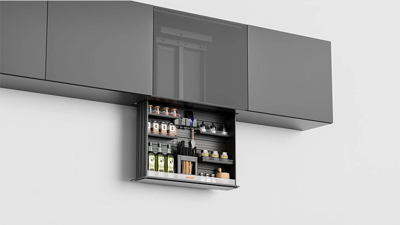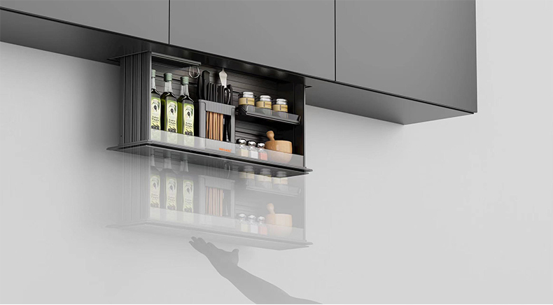 Khu vực tủ bếp trên thường được dùng để lưu trữ bát đĩa thì nay với giá gia vị nâng hạ điện cảm ứng và giọng nói Garis | Megkel ML05.80X, gia chủ có thể tận dụng để sắp xếp bảo quản các chai lọ, gia vị và dụng cụ nhà bếp một cách gọn gàng, tối ưu nhất.