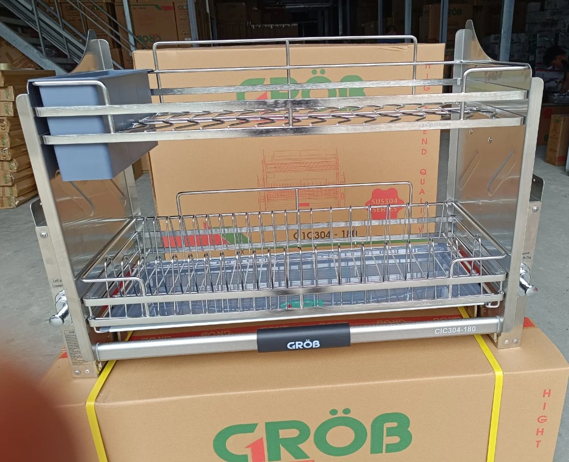 Giá bát đĩa nâng hạ Grob C1C304-190 còn được xem là một vật trang trí giúp cho căn bếp trở nên sáng và đẹp hơn. Được làm từ chất liệu INOX SUS304 dạng nan cao cấp.