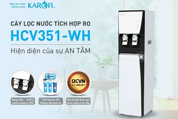 Cây lọc nước nóng lạnh Karofi HCV351-WH đạt chuẩn quốc gia, lọc nước đạt tiêu chuẩn nước tinh khiết uống trực tiếp không cần đun sôi, an toàn tuyệt đối sức khỏe người tiêu dùng. Thiết bị đảm bảo vận hành hiệu quả, tiết kiệm điện năng, hàng chính hãng Karofi.