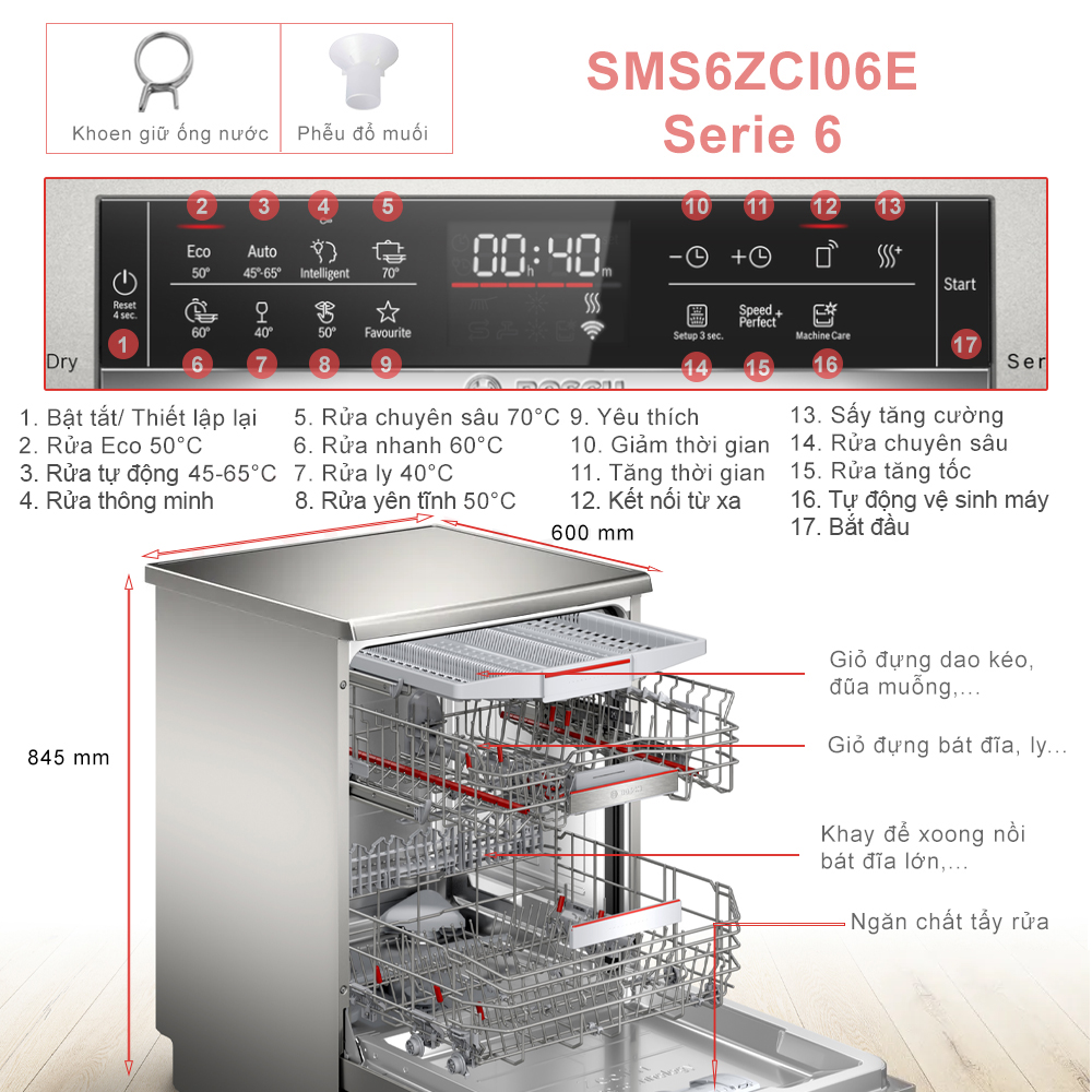 Máy rửa bát Bosch SMS6ZCI06E sở hữu kiểu dáng độc lập, cho phép người dùng bố trí linh hoạt ở nhiều vị trí khác nhau trong không gian bếp mà không phụ thuộc vào hệ tủ cố định. Thân máy được hoàn thiện bằng chất liệu thép không gỉ cao cấp, bề mặt inox xám sang trọng, giúp không gian bếp trở nên hiện đại và đồng bộ hơn. Thiết kế vuông vức chắc chắn mang lại cảm giác bền bỉ, ổn định trong quá trình vận hành. Trên thân máy là bảng điều khiển cảm ứng được thiết kế trực quan, dễ thao tác; màn hình LED hiển thị thời gian và trạng thái của máy giúp người dùng theo dõi quá trình rửa một cách thuận tiện. Với kích thước tiêu chuẩn 845 x 600 x 600 mm, máy rửa bát Bosch SMS6ZCI06E phù hợp cho mọi loại bếp từ chung cư đến nhà phố.